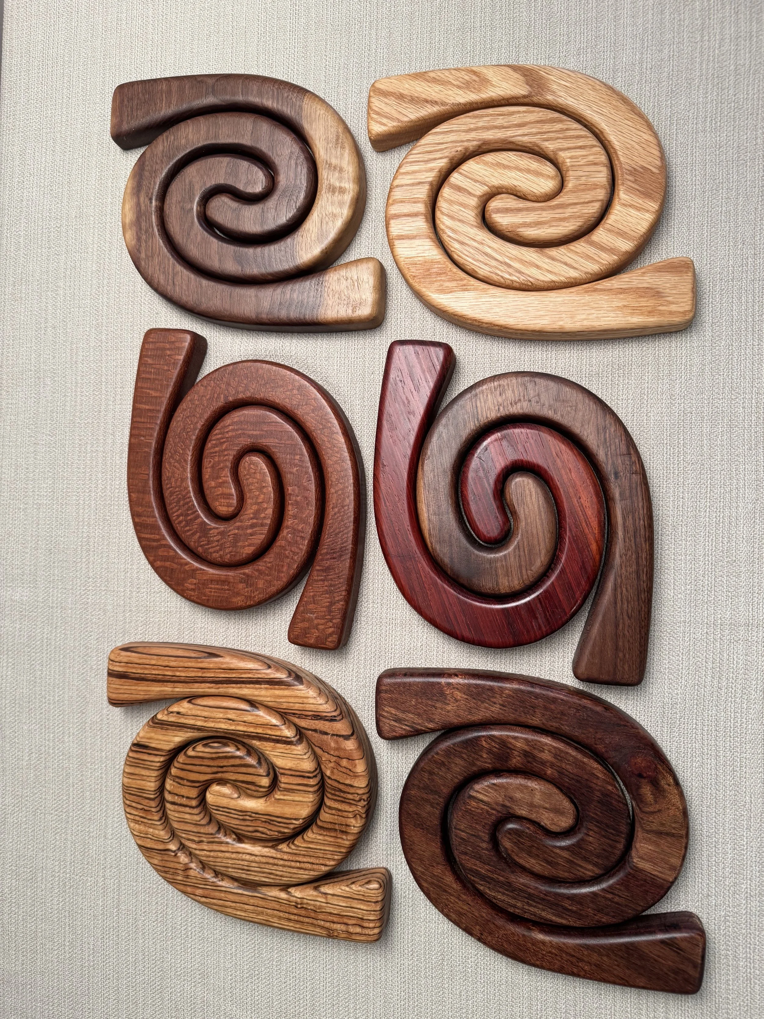 Trivets!Functional yet artsy enough for display? Yes! Spiral trivets $45.00 Zebrawood Walnut Rosewood White oak Red oak Multi Lacewood Padauk_Walnut Add To Cart Added! Design your trivet! $45.00 View Options Circle trivet ~ mahogany $25.00 Add To Cart Added!